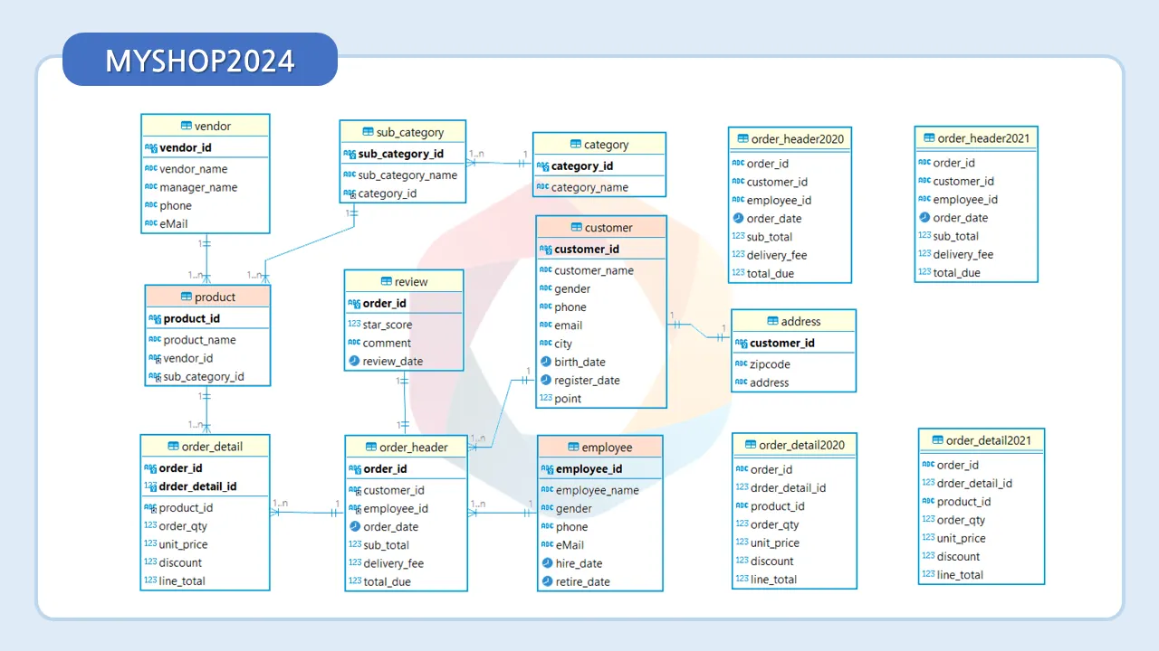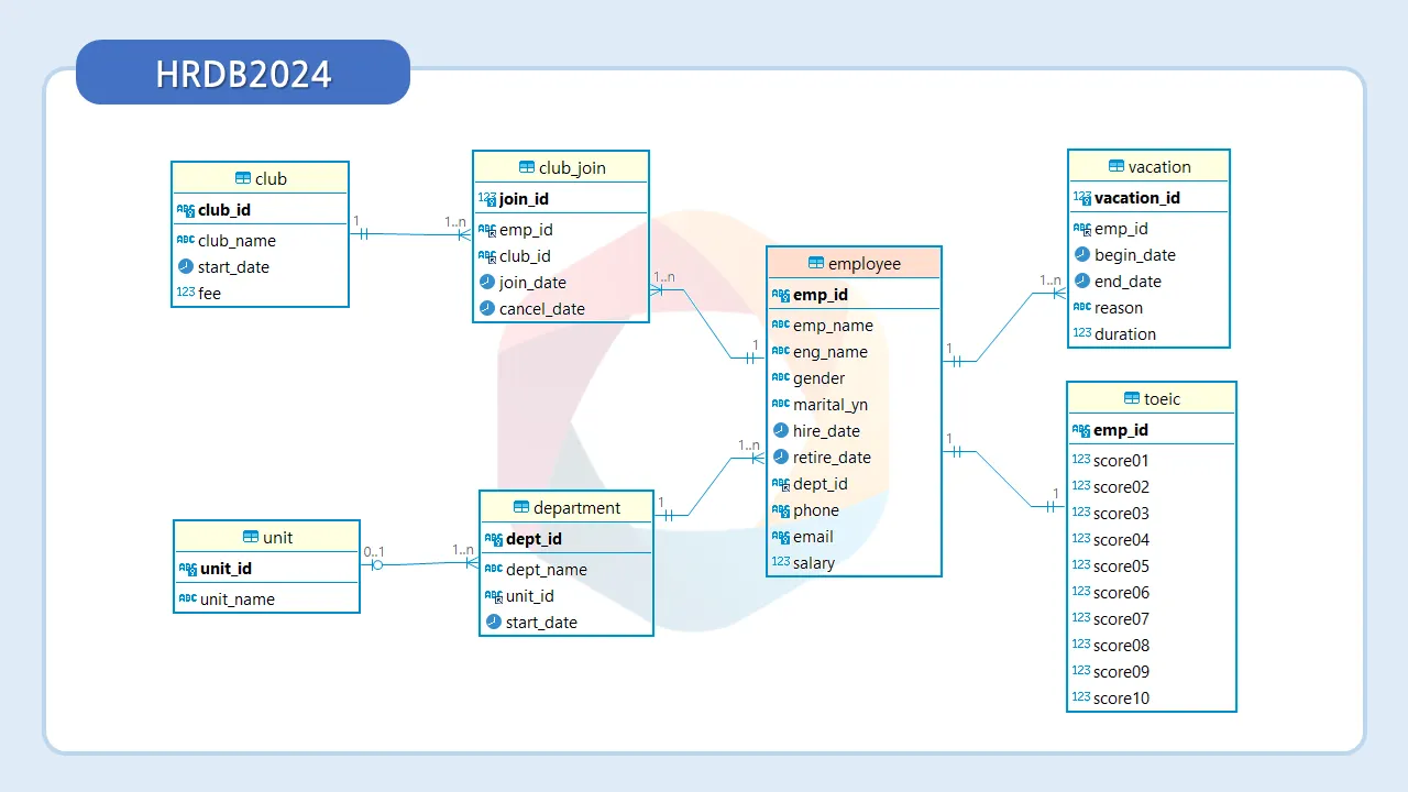 ๋ฌด์์ ์ฌ์ฉ๋๋ ๋ฐ์ดํฐ๋ฒ ์ด์ค์ ์ ์ฌํ ํํ์ ๋ฐ์ดํฐ๋ฒ ์ด์ค๋ฅผ ์ฌ์ฉํ์ฌ ํ์ต ํจ์จ์ ํฅ์์ํต๋๋ค. ์๋ ๋ค์ด์ด๊ทธ๋จ์ ์ธ์ฌ ๋ฐ์ดํฐ๋ฒ ์ด์ค์ ์ผํ๋ชฐ ๋ฐ์ดํฐ๋ฒ ์ด์ค๋ฅผ ๋ณด์ฌ์ฃผ๋ฉฐ, ์ด๋ค์ ๊ฐ๊ฐ SQL ๊ธฐ๋ณธ ๊ตฌ๋ฌธ๊ณผ ๊ณ ๊ธ ๊ตฌ๋ฌธ ํ์ต์ ์ํด ์ฌ์ฉ๋ฉ๋๋ค. ๋ํ, ๋ค์ํ ์